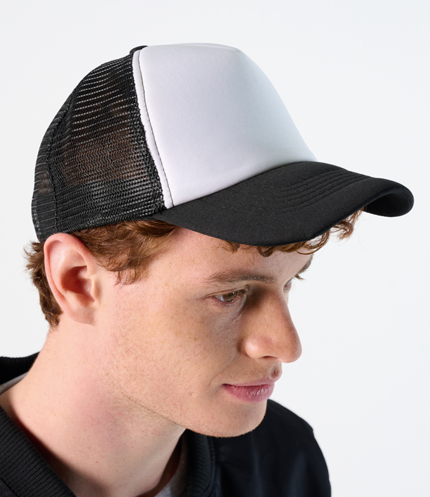 100% polyester. 5 panel. Mesh rear panels. Plastic size adjuster. Suitable for sublimation printing.