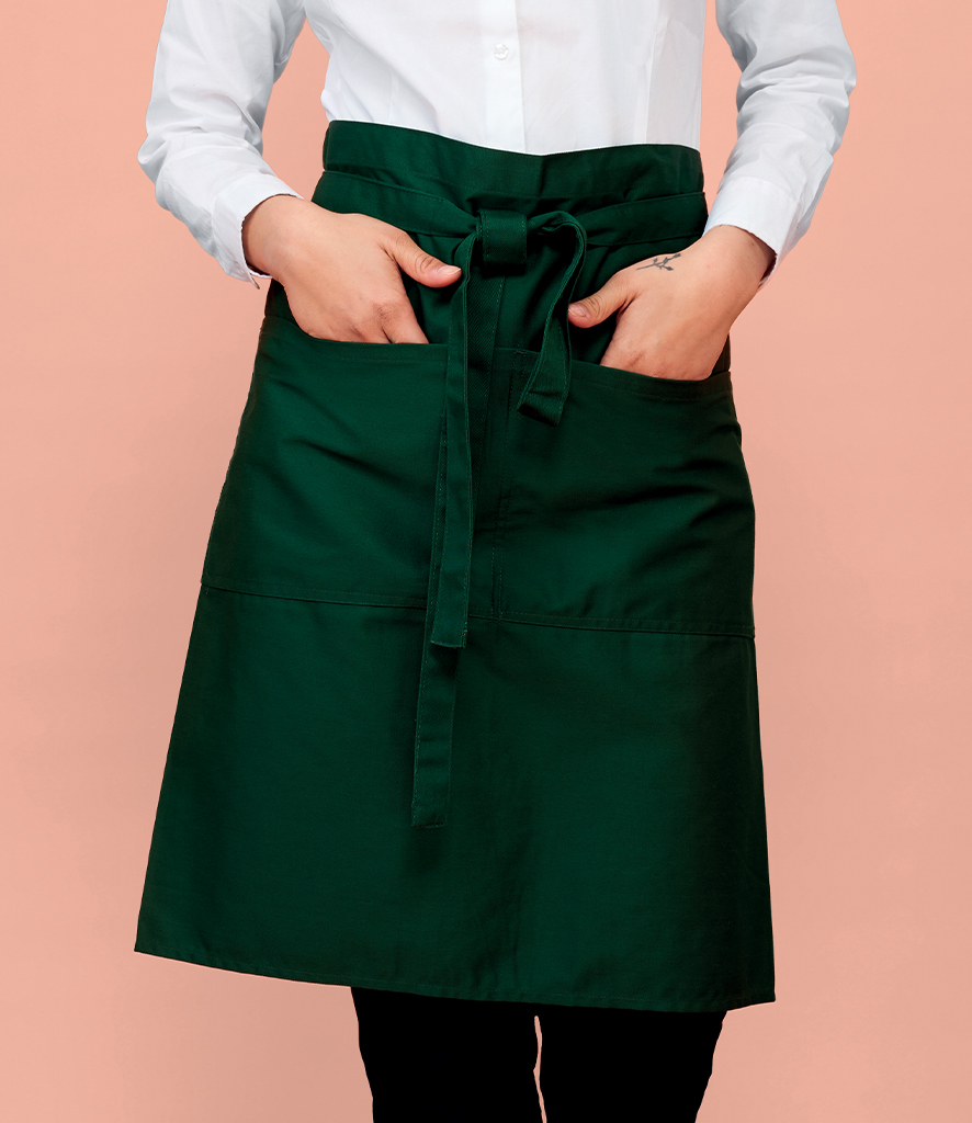 65% polyester/35% cotton. Large front pocket with two compartments. Self fabric ties. Width 90cm. Length 65cm. Domestic wash 60°C.