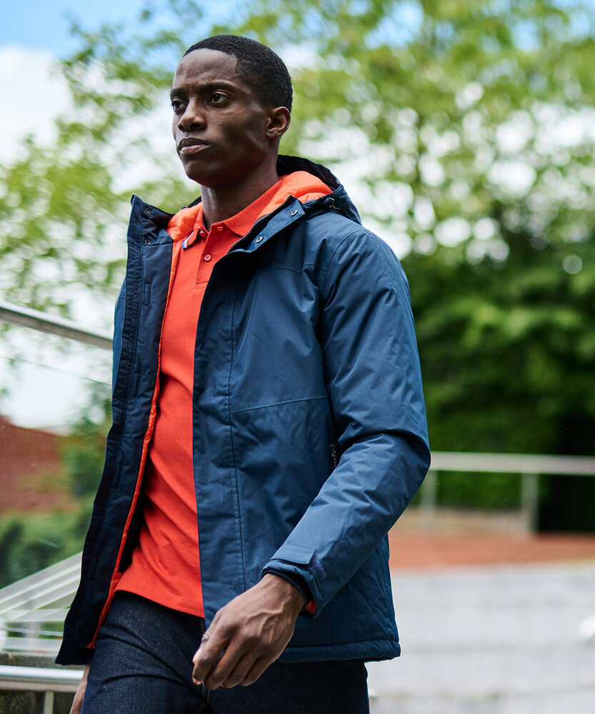 Waterproof Hydrafort 5000 polyester fabric with taped seams and a DWR (Durable water-repellent) finish for all-weather protection. Rechargeable copper heating zone to regulate your temperature. Power Bank Battery Operated* Thermo-guard 140gsm body insulation. Grown on insulated hood, reflective details front and back and storm cuffs for added weather protection. Inner mobile phone pocket and battery pocket. Charge your phone on the go. 1 Zipped Chest pocket and 2 zipped lower pockets. Concealed zip in lining for embroidery access and shock cord adjusters at face and hem. Battery pack is not included, please see RG004